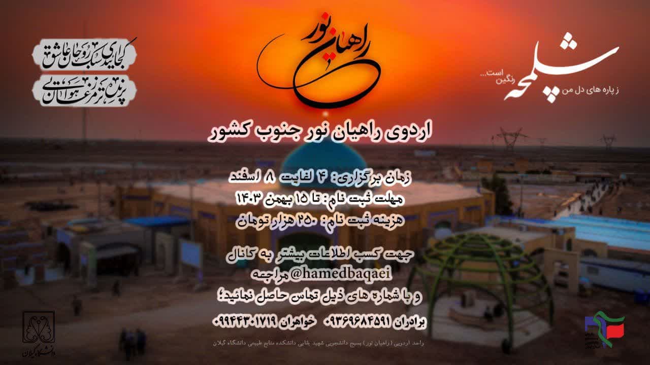 اردوی دانشجویی راهیان نور دانشکده منابع طبیعی به مناطق عملیاتی جنوب کشور در  بازه زمانی 4 لغایت 8 اسفند برگزار خواهد شد. علاقمندان برای  ثبت نام و شرکت در این اردوی سیاحتی می توانند تا تاریخ ۱۵ بهمن به دفتر بسیج دانشجویی دانشکده مراجعه فرمایند.
