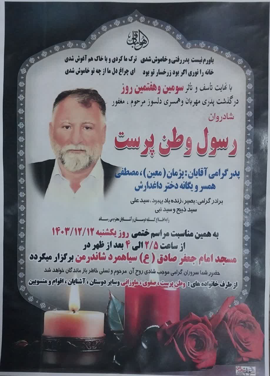 شایان ذکر است مجلس ترحیم آقای رسول وطن پرست روز یکشنبه مورخ 1403/12/12ساعت 14:30 الی 16 در مسجد امام جعفر صادق (ع) سیاهمرد شاندرمن برگزار می گردد.