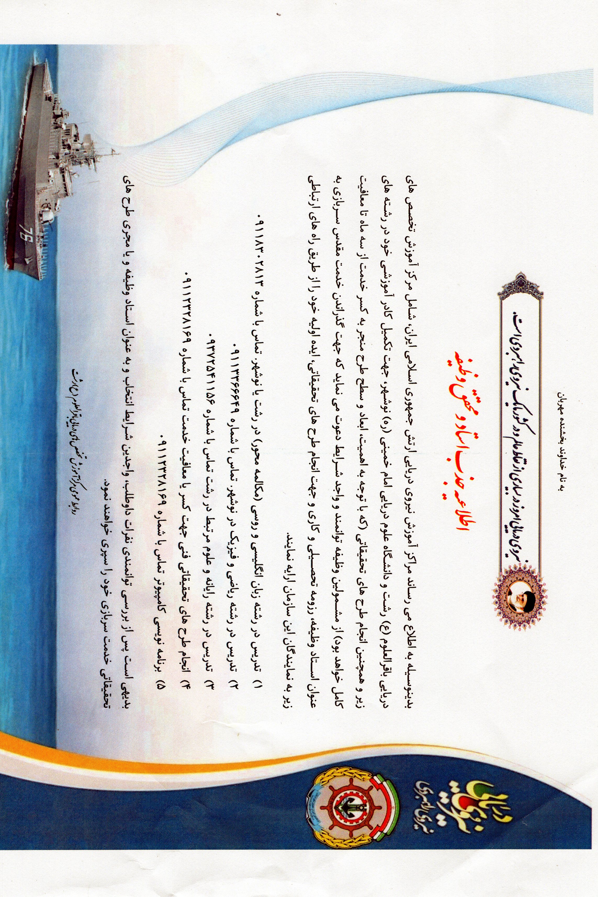 جذب استاد و محقق وظيفه در مراکز آموزش نیروی دریایی ارتش جمهوری اسلامی ایران